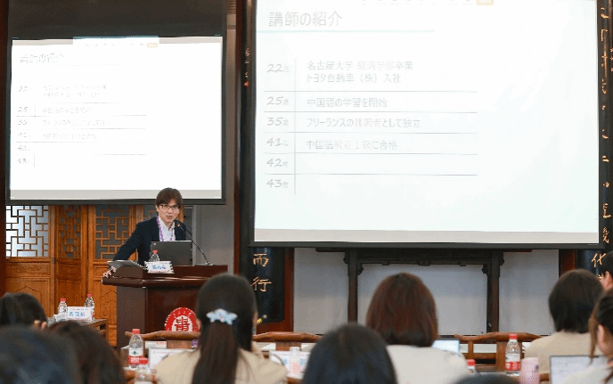 资深翻译櫨博信做了题为“翻译技巧概论”的报告。详细介绍了翻译技巧的核心构成要素,结合具体事例生动形象地分析了语言能力、知识储备能力及理解能力三个核心要素。最后,结合口译中常见的问题以及人工智能是否能够取代翻译等问题与全体参会教师进行了互动与探讨。